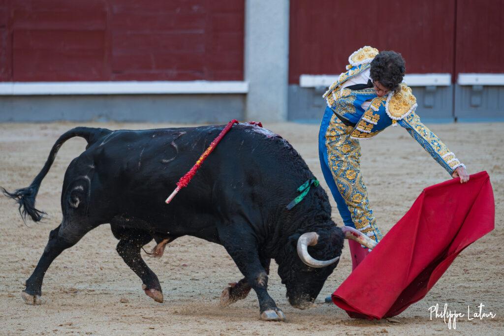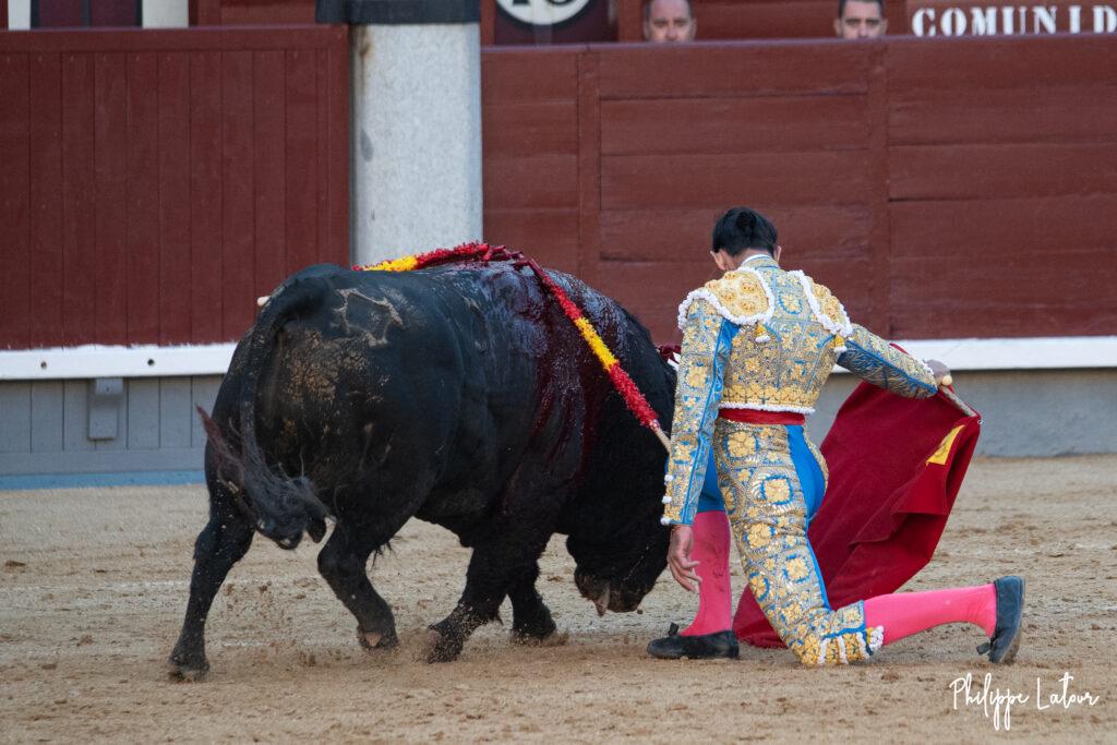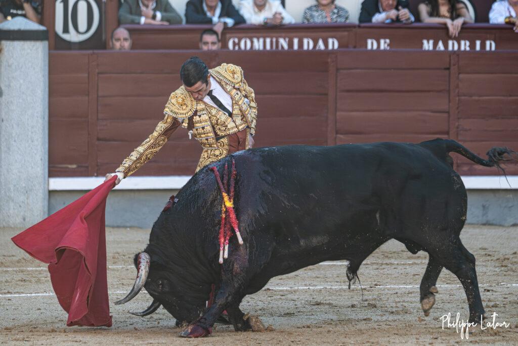Toro distrait et pas franc du collier dans ses charges à sa sortie. Il malmène cheval et picador lors de la 1ère pique, plus anodin sur la seconde. Le 7 demande que la cuadra Equigarce soit mise hors de Madrid…ambiance…Début pas doblones du plus bel effet, suivi de passes en rond un genou en terre où le côté droit est celui que goûte le plus l’animal. C’est sur ce côté que va se dérouler majoritairement la faena de Fortes. Bien guidées et liées, les passes manquent d’un petit quelque chose pour donner le grand frisson, un placement plus dans le terrain du toro peut-être… Le passage à gauche est plus brouillon. Longuet aux aciers. Saluts de Fortes, palmas au toro.