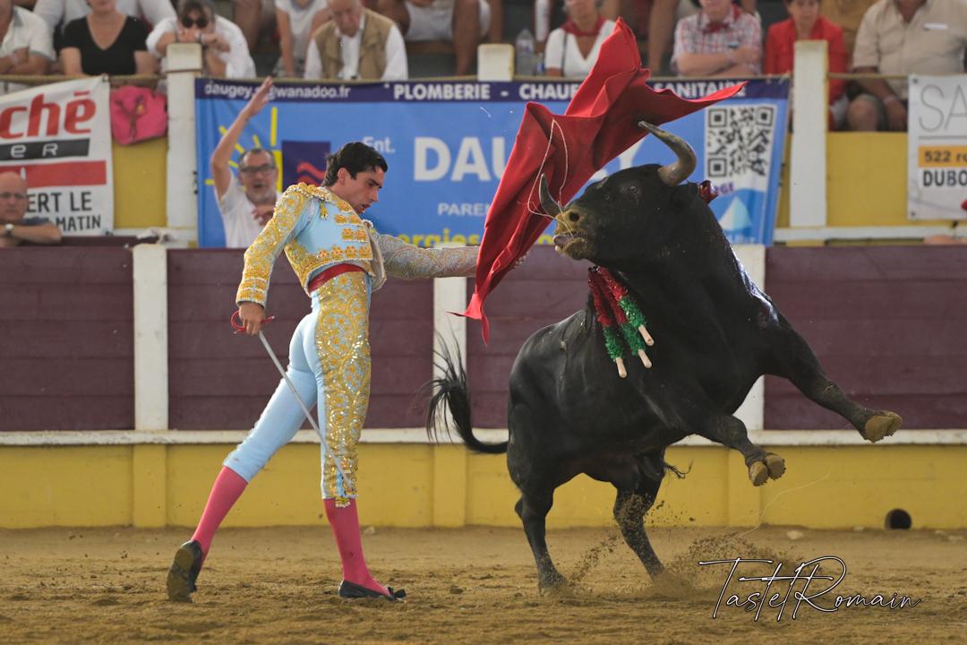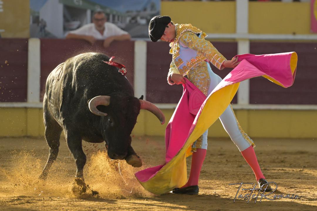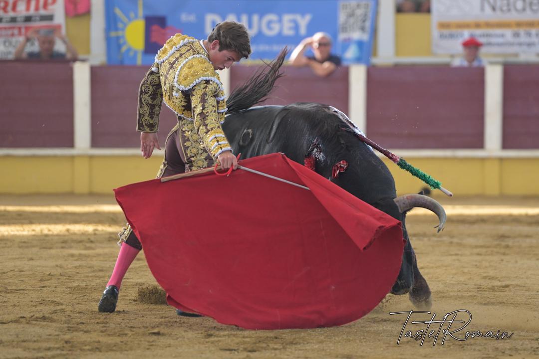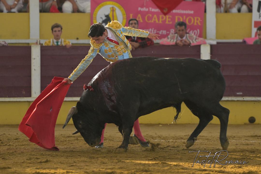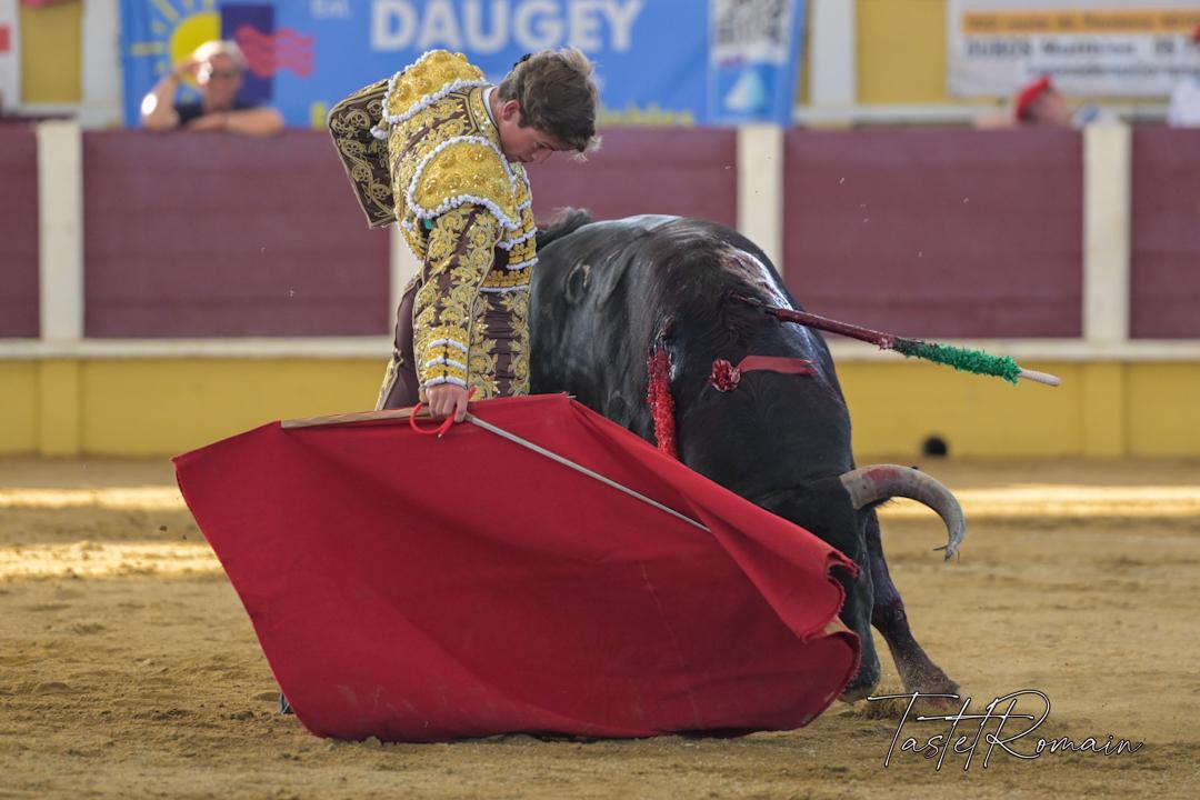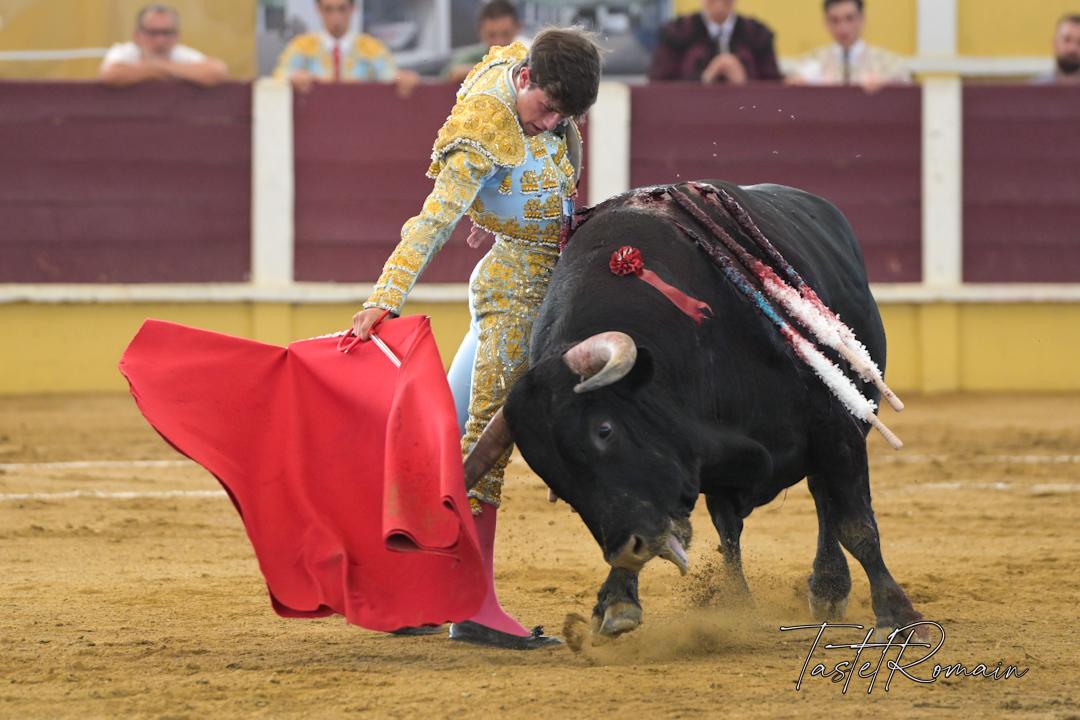 Le quatrième est bien présenté. Il met la tête dans la cape de Aaron Palacio. Il prend un fort, trop fort puyazo, en poussant. Début de faena par des doblones appuyés, Palacio enchaîne ensuite à droite. Le novillo est noble. A gauche, il manque de chispa. Il est en fait plus soso que noble. Palacio a du talent et parvient à donner du relief à la faena. Le novillo finit par s’éteindre et la faena va » à menos « . Final dans les tablas,la première entrée à matar se solde par un pinchazo, la seconde par une entière suffisante. Une oreille.