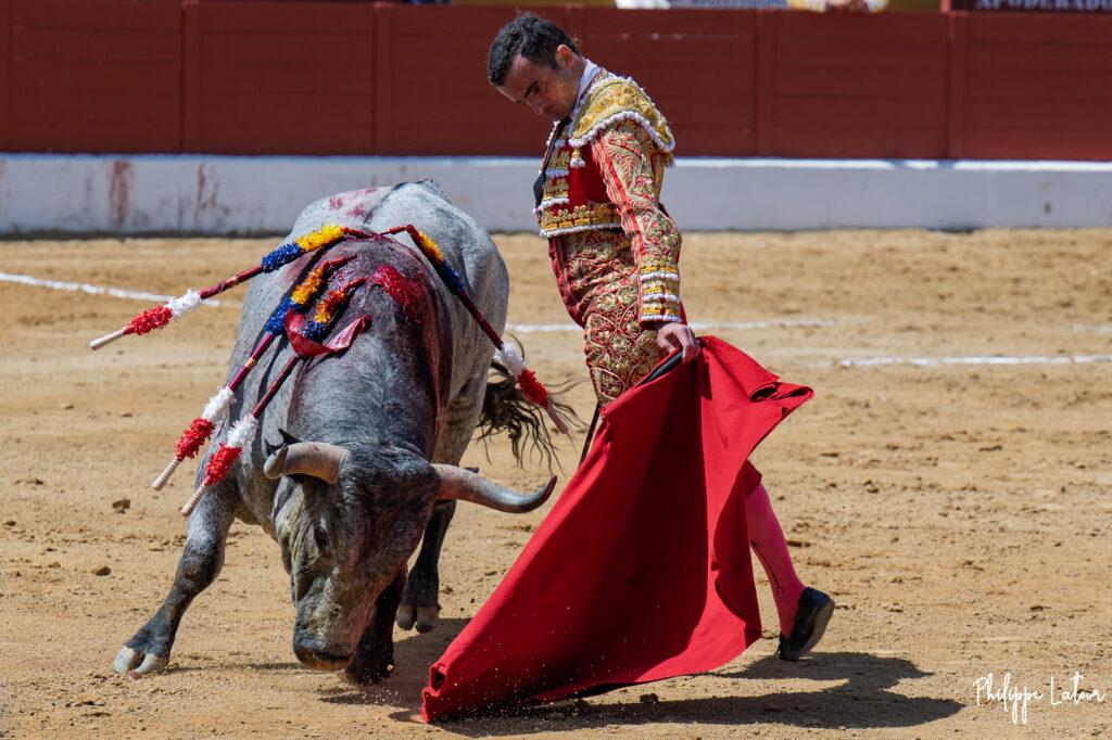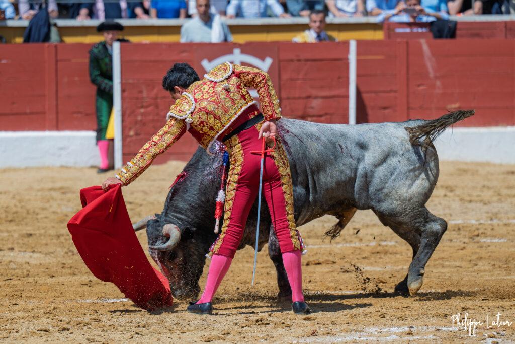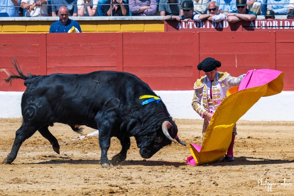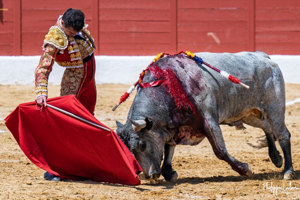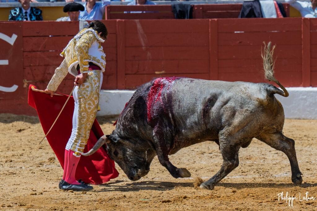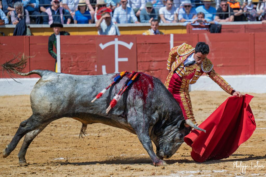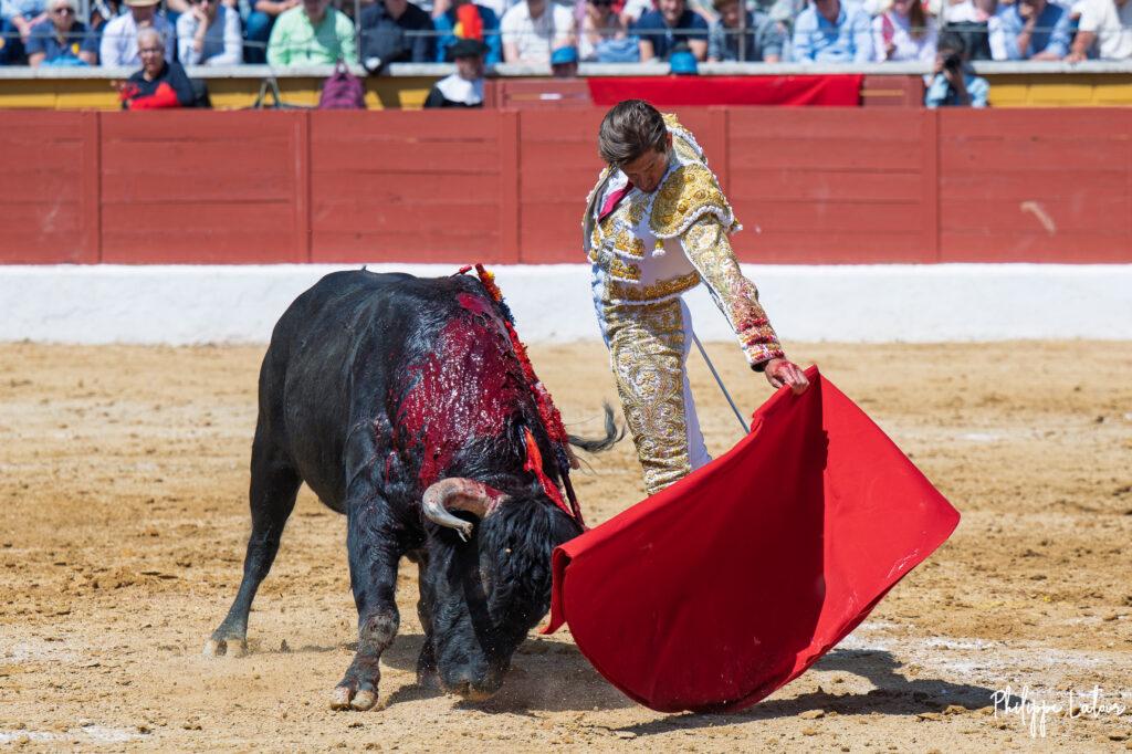 Le troisième a une corne astillada. Bien reçu par Maxime Solera, il prend un premier puyazo trasero en mettant les reins. Bien piqué, il s’emploie moins à la seconde rencontre. Placé loin, il se rapproche pas à pas pour une dernière rencontre légère. Bon début de faena par doblones, Maxime continue par des derechazos méritoires. Le toro se défend dans la muleta à droite et passe mieux à gauche. Le Français enchaîne deux bonnes séries de naturelles. Le toro baisse de rythme et la faena va a menos. Deux pinchazos précèdent une entière contraire. Un avis sonne, c’est compliqué avec le descabello. Un second avis sonne et le toro tombe. Silence.