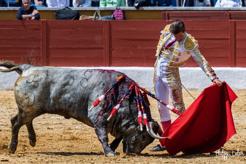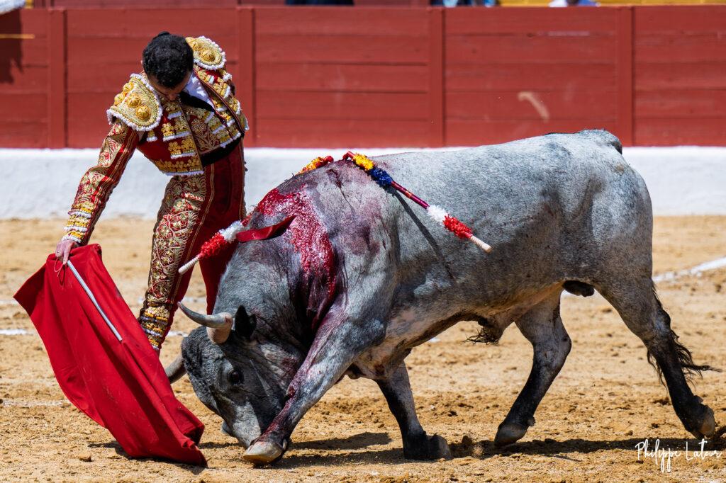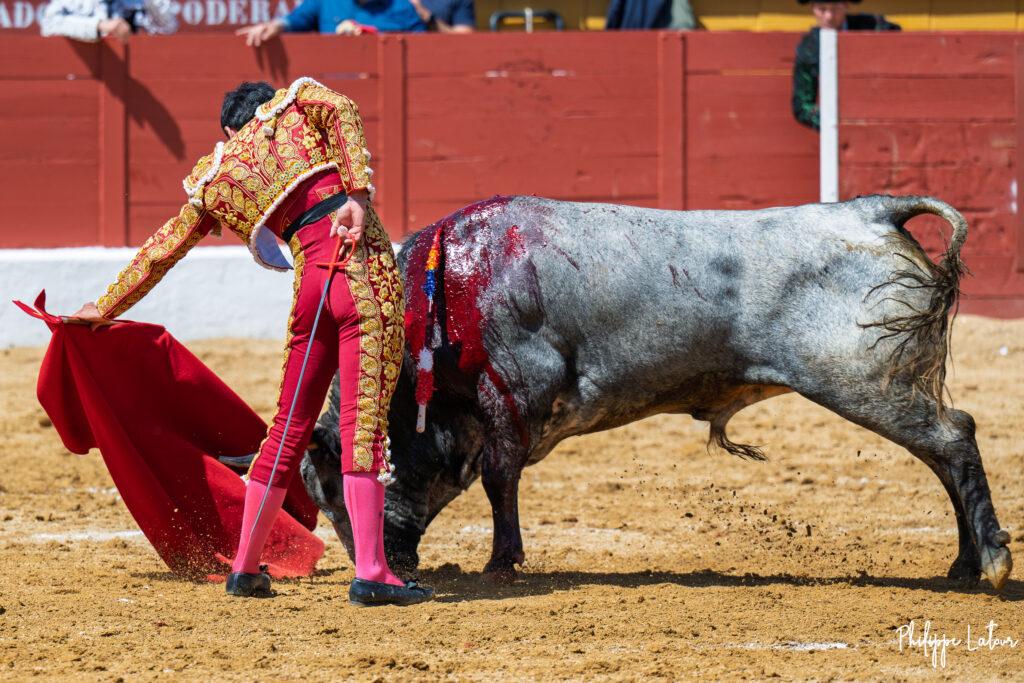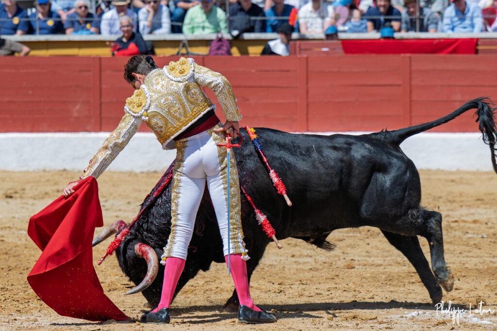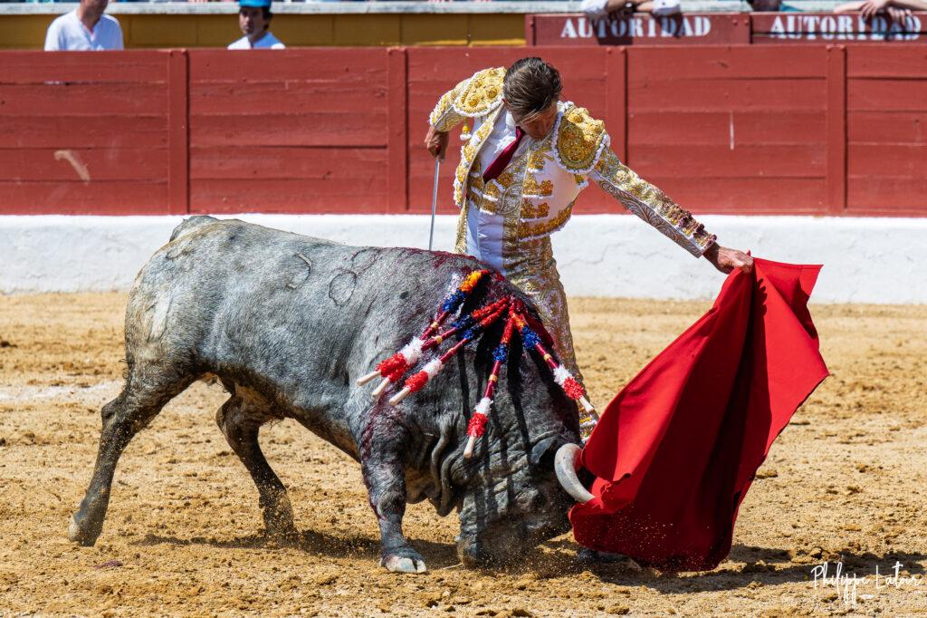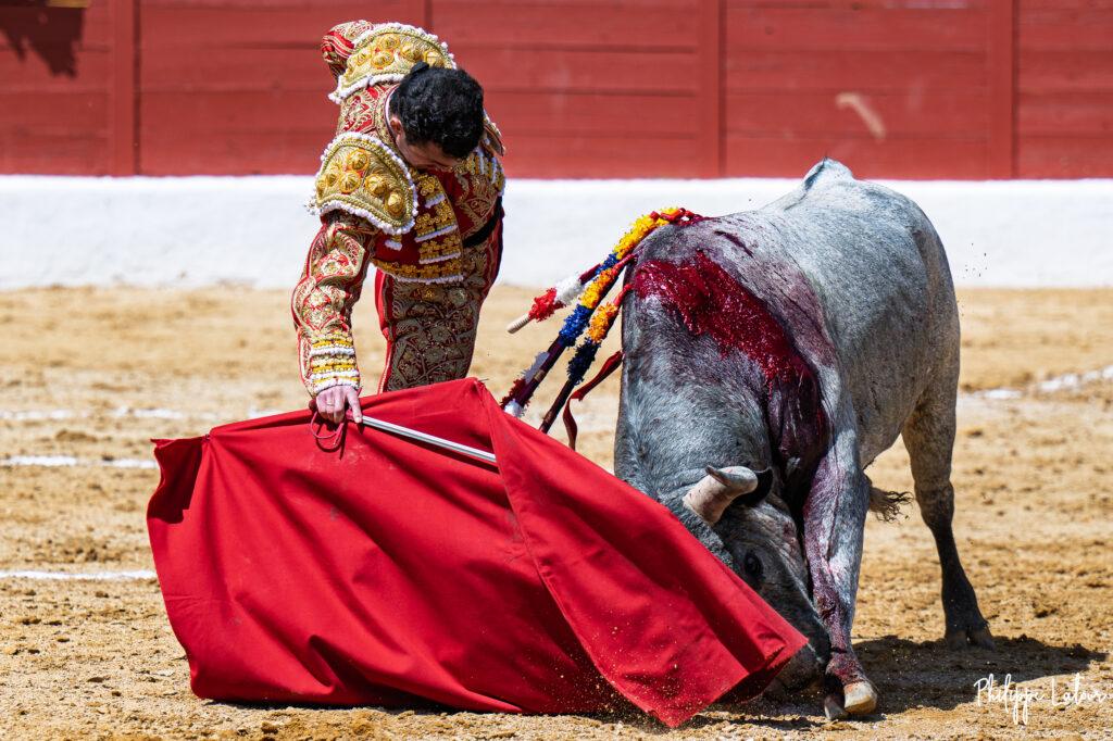 Le troisième a une corne astillada. Bien reçu par Maxime Solera, il prend un premier puyazo trasero en mettant les reins. Bien piqué, il s’emploie moins à la seconde rencontre. Placé loin, il se rapproche pas à pas pour une dernière rencontre légère. Bon début de faena par doblones, Maxime continue par des derechazos méritoires. Le toro se défend dans la muleta à droite et passe mieux à gauche. Le Français enchaîne deux bonnes séries de naturelles. Le toro baisse de rythme et la faena va a menos. Deux pinchazos précèdent une entière contraire. Un avis sonne, c’est compliqué avec le descabello. Un second avis sonne et le toro tombe. Silence.
