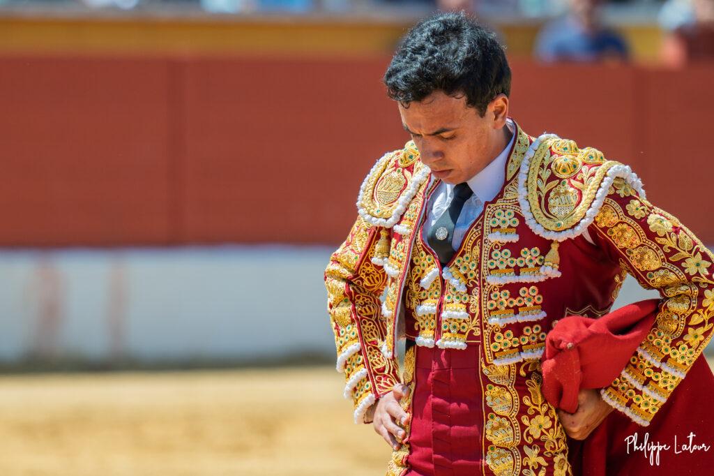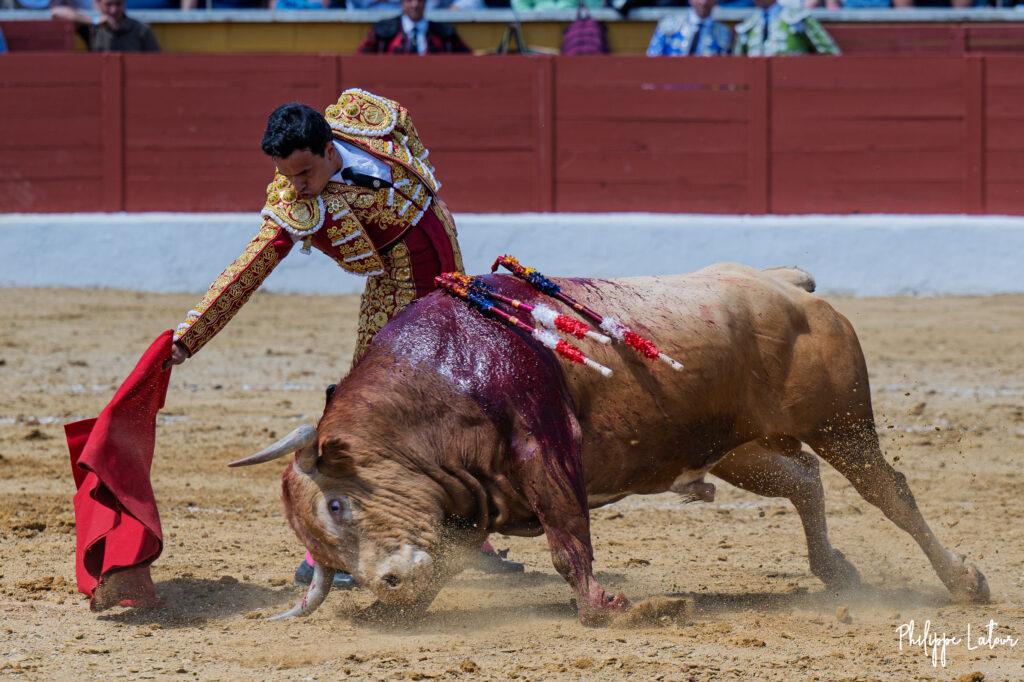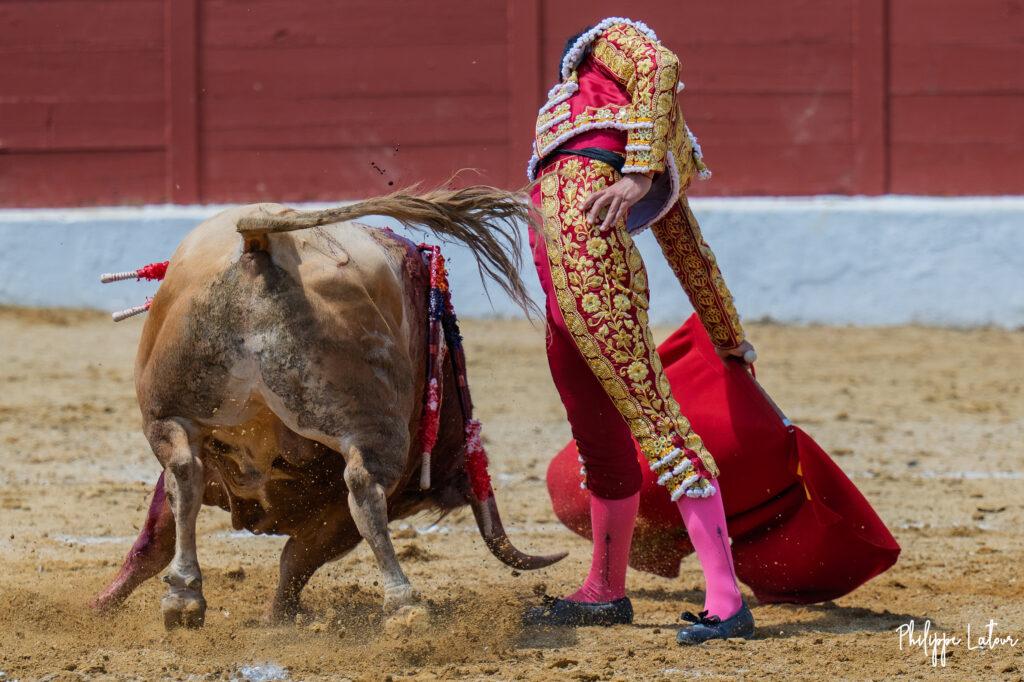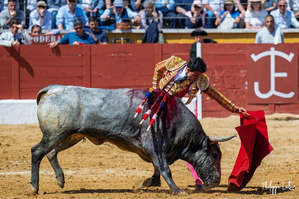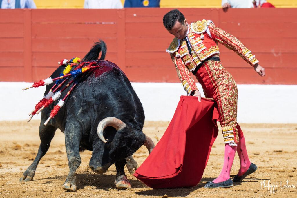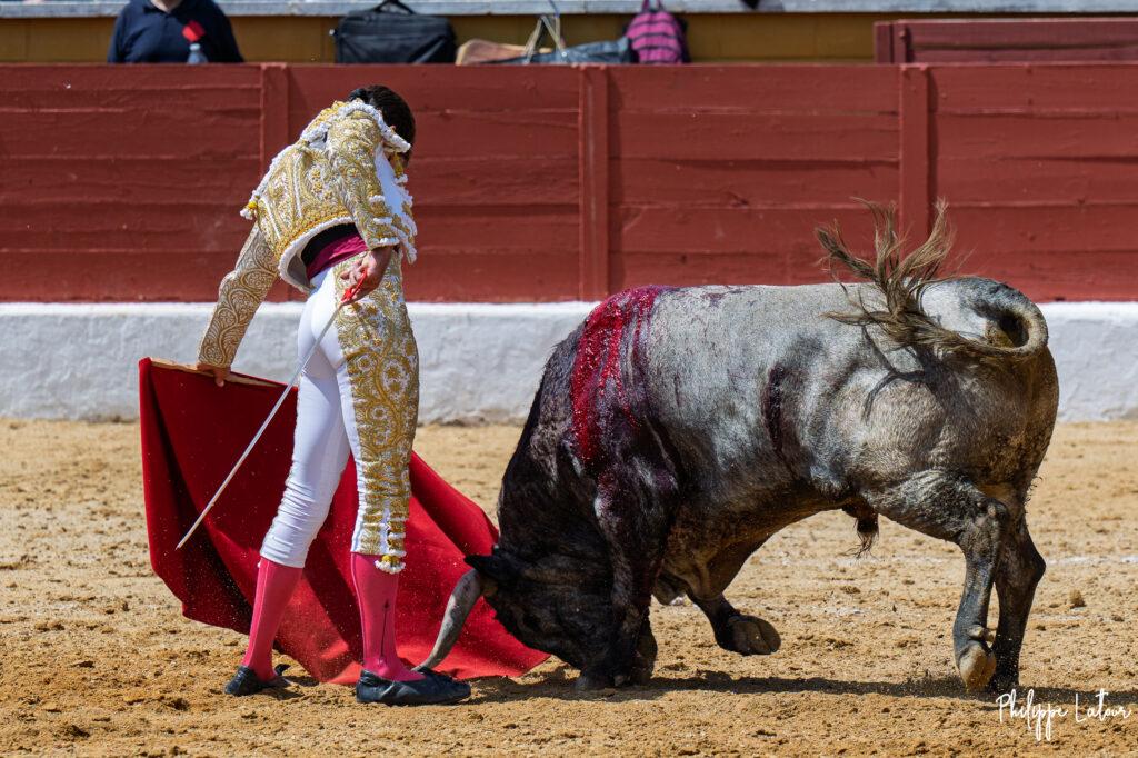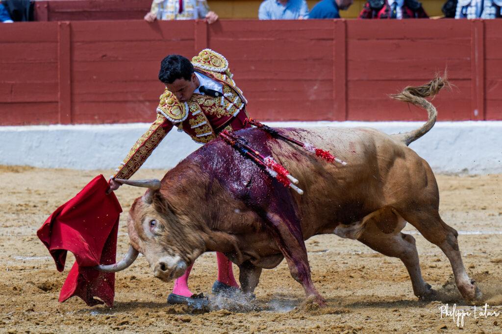 Le troisième a une corne astillada. Bien reçu par Maxime Solera, il prend un premier puyazo trasero en mettant les reins. Bien piqué, il s’emploie moins à la seconde rencontre. Placé loin, il se rapproche pas à pas pour une dernière rencontre légère. Bon début de faena par doblones, Maxime continue par des derechazos méritoires. Le toro se défend dans la muleta à droite et passe mieux à gauche. Le Français enchaîne deux bonnes séries de naturelles. Le toro baisse de rythme et la faena va a menos. Deux pinchazos précèdent une entière contraire. Un avis sonne, c’est compliqué avec le descabello. Un second avis sonne et le toro tombe. Silence.
