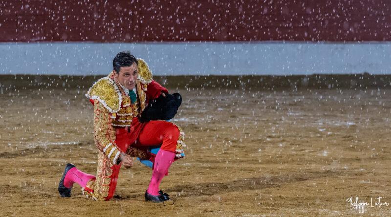 Nouveau second tercio à émotion, les deux banderilleros Francisco Javier Tornay et Hernan Alonso sont ovationnés. Début de faena par doblones, Sanchez Vara veille au grain. A gauche, le toro est violent. Montero s’arrime. Le toro part aux planches. Dans ce terrain, le torero s’expose et arrache avec le cœur et une certaine efficacité des derechazos méritoires dont l’émotion monte jusqu’au sommet des gradins. Le public est debout. L’épée est égèrement tombée. Le toro tarde se coucher, un avis sonne. Vuelta très applaudie malgré l’orage qui finit par éclater et fait fuir les spectateurs des gradins. On aurait pu faire une exception vu le contexte et, comme on le fait trop souvent pour les figuras, donner une oreille à Francisco Montero.